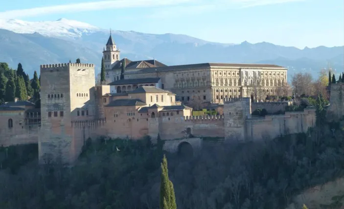 In der Bildmitte die Paläste mit dem Comaresturm, dahinter das Quadrat des Karlspalastes und im Hintergrund die Sierra Nevada.