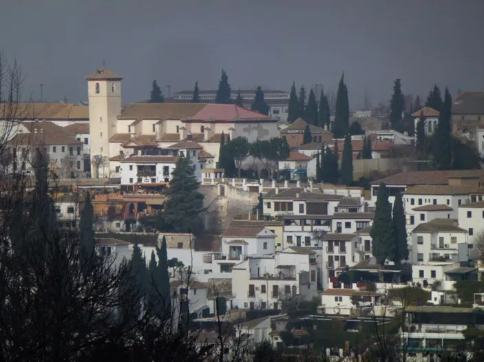 Der Albaicín von der Alhambra aus. Auffallend sind die vielen Bäume zwischen den weißen Fassaden. Das architektonische Grundmuster des Viertels ist der „Patio“, der Innenhof mit Garten.