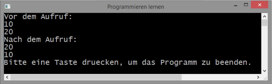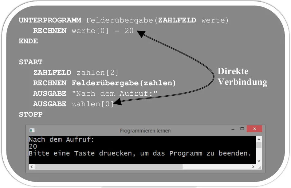 BEMERKUNG: *************************BEMERKUNG: Programmbeispiel:BEMERKUNG: Felder an Unterprogramme übergebenBEMERKUNG: *************************UNTERPROGRAMM Felderübergabe(ZAHLFELD werte)RECHNEN werte[0] = 20RECHNEN werte[1] = 10ENDESTARTZAHLFELD zahlen[2]RECHNEN zahlen[0] = 10RECHNEN zahlen[1] = 20AUSGABE "Vor dem Aufruf:"AUSGABE zahlen[0]AUSGABE zahlen[1]RECHNEN Felderübergabe(zahlen)AUSGABE "Nach dem Aufruf:"AUSGABE zahlen[0]AUSGABE zahlen[1]STOPP