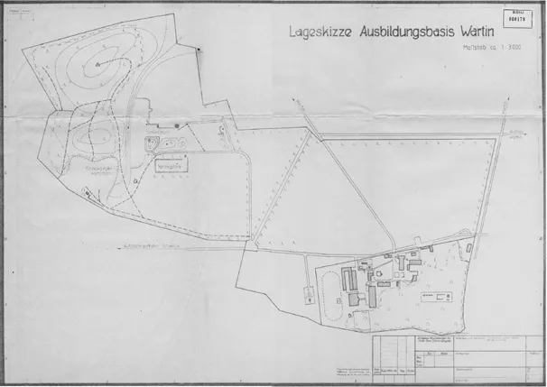 Das Ministerium unterhielt bis zu seiner Auflösung 1990 unmittelbar hinter der Grenze zum damaligen Bezirk Frankfurt (Oder) ein geheimes Ausbildungsobjekt. Das Dienstobjekt „Der lange Ort“ am Rand des uckermärkischen Wartins firmierte mit seinen fast 50 Hektar großen Ausbildungsflächen nahe dem vorpommerschen Grünz intern unter dem Tarnnamen „Wally“1. Es war eine von drei Einrichtungen, die der Geheimdienst 1962 von der Verwaltung 15 des Ministeriums für Nationale Verteidigung übernommen hatte und aus der 1973 durch Zusammenlegung der drei Objekte seine Zentrale Fachschule (ZF) Wartin wurde.