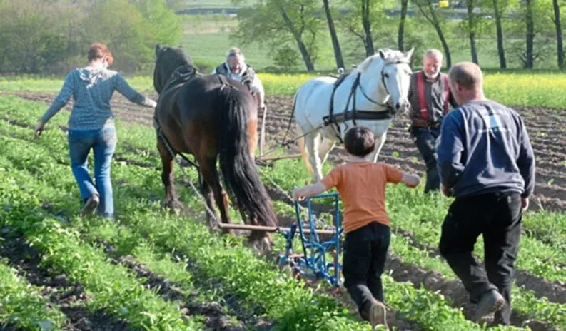 Pente. Pferdearbeit in der Landwirtschaft? Zugpferdefreunde aus der Region haben sich auf dem CSA-Hof in Pente getroffen und haben auf einem Gemüseacker den Einsatz der Arbeitspferde erprobt.