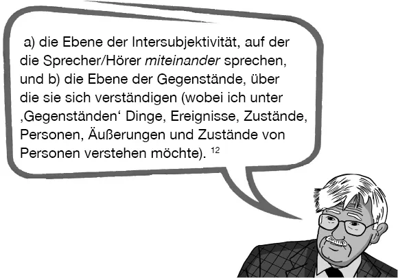 Bereits vor der Ausarbeitung seines Hauptwerkes macht Habermas in einer Vorstudie eine interessante Entdeckung. Die sprachliche Verständigung, so Habermas, hat eine schillernde Doppelstruktur. Sie läuft gleichzeitig auf zwei verschiedenen Ebenen ab, der Inhaltsebene und der Beziehungsebene, wobei wir die zweite Ebene meistens übersehen oder nur unterschwellig wahrnehmen. Sie ist aber immer präsent. Denn, sobald wir als Sprecher und Hörer mit einem anderen Menschen ins Gespräch kommen, geht es keineswegs nur um das inhaltlich Gesagte, sondern gleichzeitig auch darum, wie wir es sagen und wie wir miteinander umgehen, also um die Beziehungsebene oder wie Habermas sagt, um die Dimension der ‚Intersubjektivität‘. Wir begeben uns automatisch auf die zwei folgenden Ebenen: