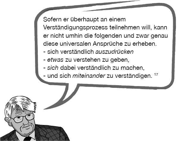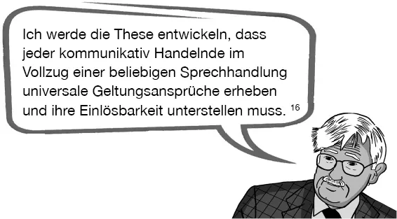 Habermas behauptet also, dass wir alle, sobald wir den Mund aufmachen und einen Satz sagen, automatisch genau diese vier von ihm entdeckten Ansprüche stellen.
