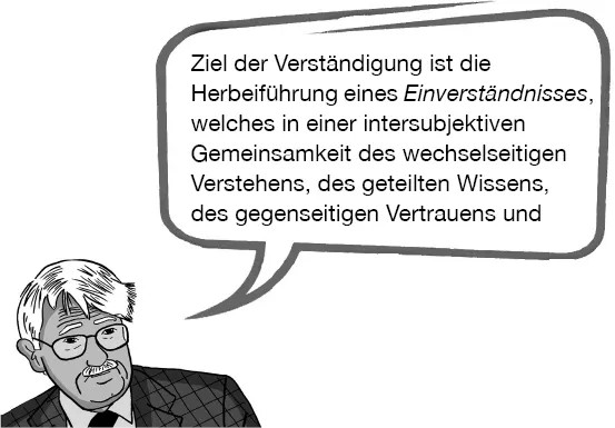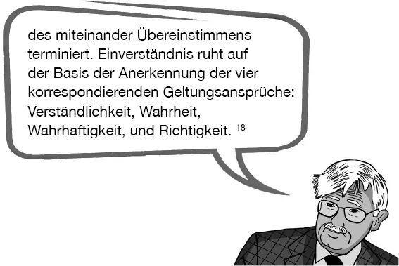 Jeder Mensch, so Habermas, geht also immer wieder hartnäckig davon aus, dass sein Wunsch nach Verständigung eingelöst wird, auch wenn natürlich nicht alle Gespräche optimal verlaufen.
