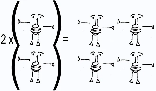 In der Multiplikation müssen die Sachverhalte jedoch anders ausgeführt werden, nämlich so, dass man entweder eine Einheit besitzt, die zweimal vorhanden ist (2 x 1 = 2) oder dass man ein Bündel mit zwei Einheiten besitzt, dass eben nur einmal vorhanden ist (1 x 2 = 2).