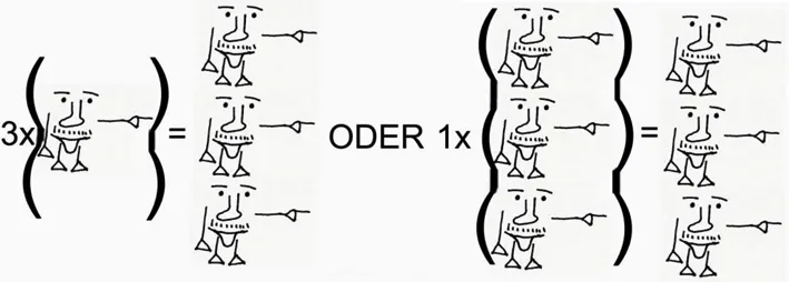 So ergibt die Addition 3 + 3 = 6 ein anderes Resultat als die Multiplikation 3 x 3 = 9. Um diese Multiplikation in einer Addition zu beschreiben, müsste man stattdessen 3 + 3 + 3 schreiben, weil man eben drei Bündel mit jeweils drei Einheiten zusammengefasst hat.