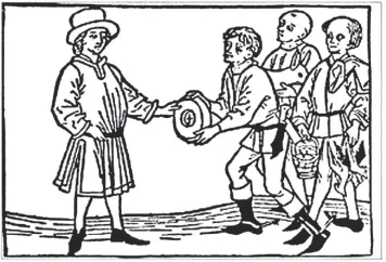 Abb.: Barhäuptige Bauern liefern ihre Abgaben an den Grundherrn ab. Holzschnitt aus dem 15. Jh.
