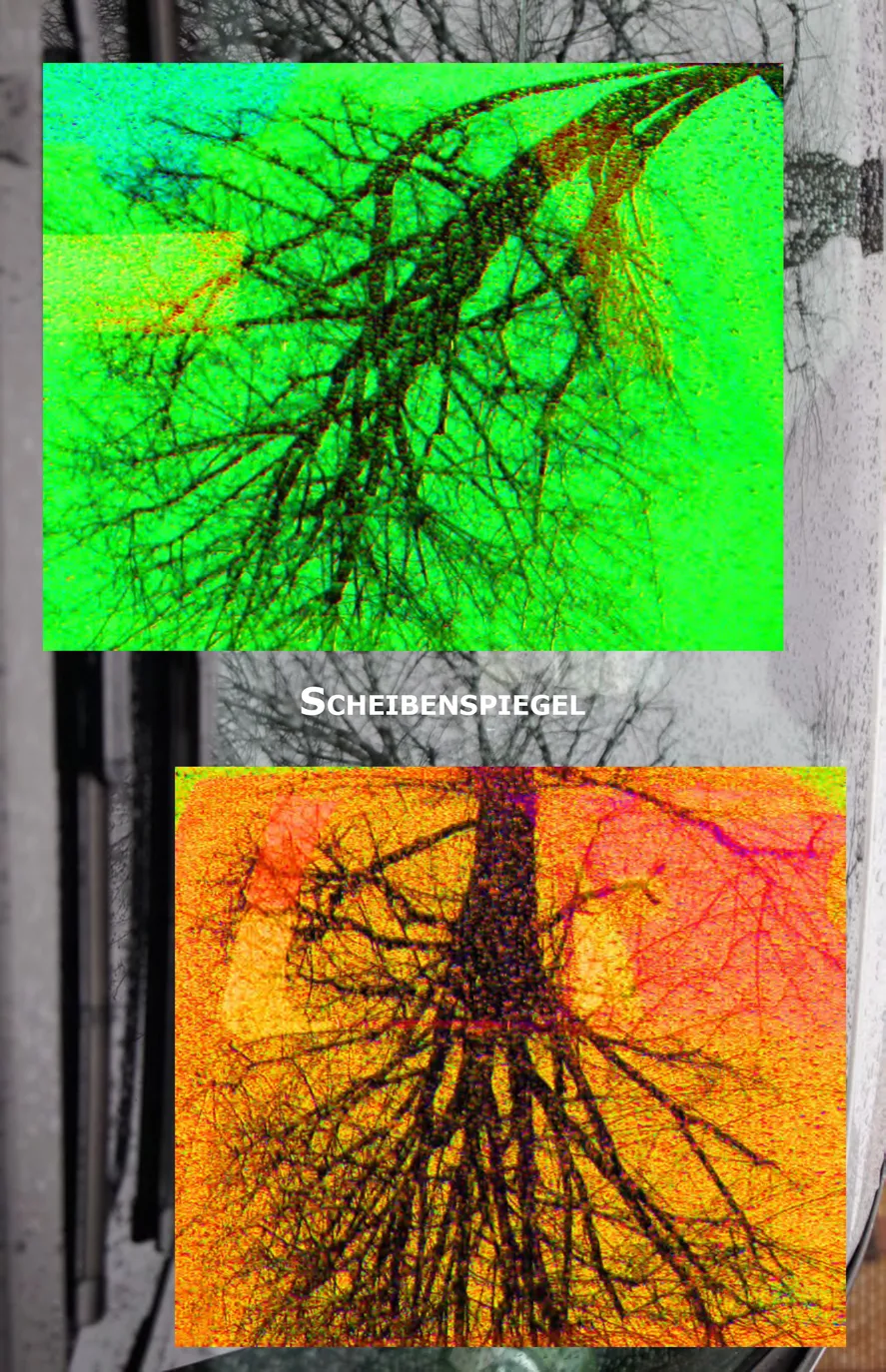 »Scheibenspiegel«, lautet der Titel der Bilder hier auf der Seite gegenüber. Also sind es die Äste eines Baumes in einer Seitenstraße einer kleinen, großen Stadt, die sich in der Scheibe eines parkenden Autos spiegeln. Grün hat sie der, dessen Name hier auf dem Buchcover steht, verfremdet. So ist es, denkst du, so muss es sein.