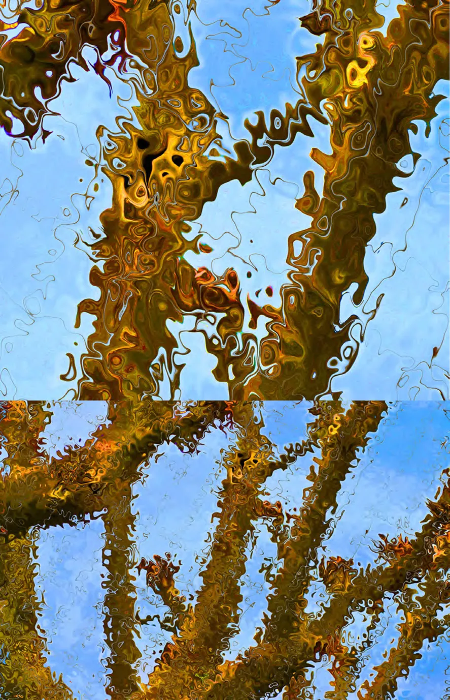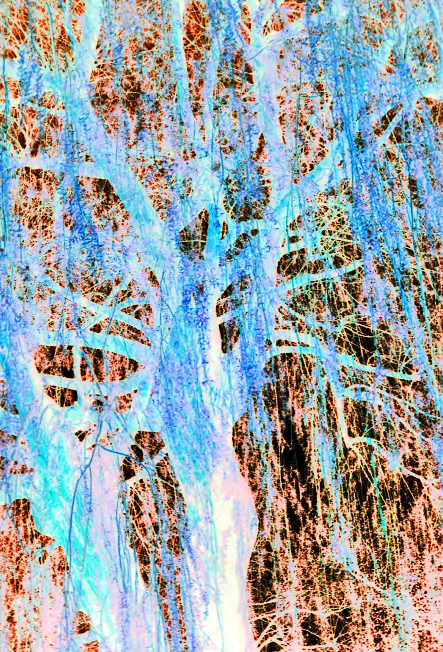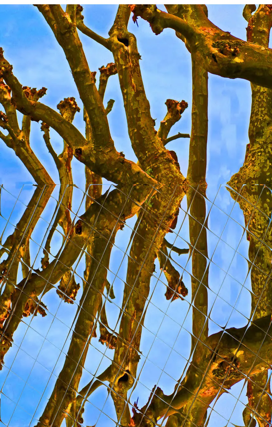 Bilder von Birken, Pappeln, Platanen, Weiden und Farnen - Stämme, Äste, Blätter in ihren faszinierenden Erscheinungen, wie sie jeder aufmerksame Beobachter entdecken kann und farblich und in der Gestalt verfremdet. Herbst- und Nachtwald, die Kennedyweide in Kaiserslautern. Schlangenarme, Sommerträume, Spiegelungen in Windschutzscheiben, Winterbäume, Wurzelfüße. Baumbilder mit fantastischen Texten garniert: Einswerden von Mensch und Baum, Sterben und Weiterleben im Jenseits. Swinging Lautern, Warten auf Godot u.v.m.