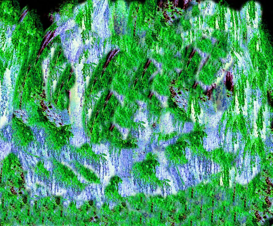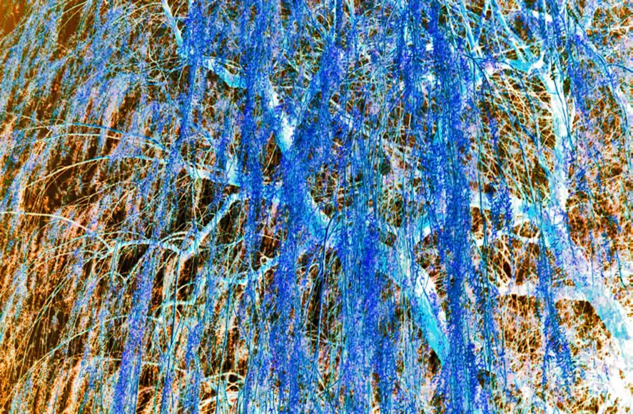 Und dann ist da noch ein anderes Abbild von dieser Weide, sind da Spiegelungen in meinem Geist - hier in diesem Buch zu sehen. Grün so grün in hellem Grau vor schwarzem sternenloser Nacht. Angestrahlt, so scheint es, verdoppelt, verschärft im Linsenlicht. Eine Weide: Einmal dort draußen, ein zweites Mal und zweimal mehr hier innen. Und wie oft wo immer auch noch? Auf den folgenden Seiten, wo sonst?