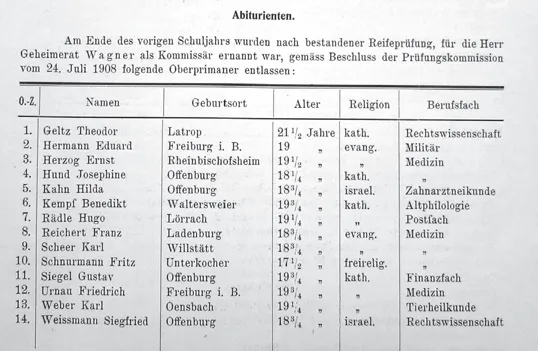 Jahresbericht 1908 Grimmelshausengymnasium Offenburg. Stadtarchiv Offenburg.