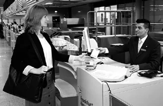 Jede Fluglinie hat ihre(n) eigenen Schalter. Außerdem teilen sich große Flughäfen in drei Bereiche: Inland-, Ausland-, Charterflüge. Wenn Sie sich nicht zurechtfinden, fragen Sie entweder Flughafenpersonal oder an einem freien Schalter. Stellen Sie sich vor, Sie seien in einem neuen Kaufhaus. Auch da weiß man am Anfang nicht, wo welche Waren untergebracht sind. Das regt Sie doch auch nicht auf, oder?