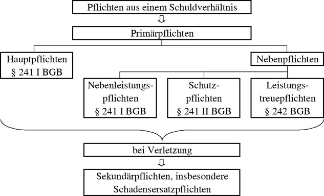 Bei den schuldrechtlichen Pflichten ist weiterhin zwischen Primär- und Sekundärpflichten zu unterscheiden. Die Primärpflichten ergeben sich unmittelbar aus dem jeweiligen Schuldverhältnis (z.B. die Pflicht des Verkäufers zur Übergabe und Übereignung des Kaufgegenstandes § 433 I S. 1 BGB, Pflicht des Vermieters zur Überlassung der Mietsache § 535 I BGB, Pflicht des Käufers/Mieters zur Bezahlung §§ 433 II, 535 II BGB). Bei Störung des Schuldverhältnisses können die Primärpflichten durch Sekundärpflichten, insbesondere Schadensersatzpflichten (v.a. nach § 280 BGB)33 ersetzt werden.