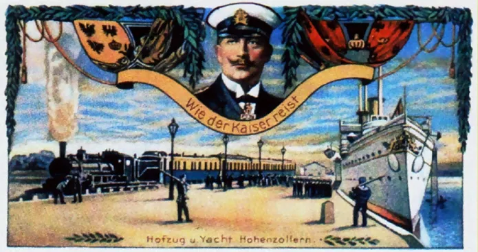 Postkarte: Wie der Kaiser reist. Hofzug und Yacht Hohenzollern