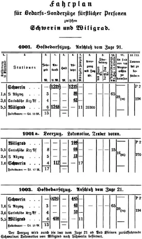 Der Regent Johann Albrecht ließ von seinem Wohnsitz, dem Schloss Wiligrad am Schweriner See, um für die Regierungsgeschäfte schnell zur Verfügung zu stehen, zwischen Schwerin und der Station Wiligrad (Lübstorf) einen Personen-Shuttleverkehr mit „Hofbedarfszügen“ einrichten, der nach einem festen Fahrplan verkehrte und in Schwerin Anschluss an Fernzüge besaß.