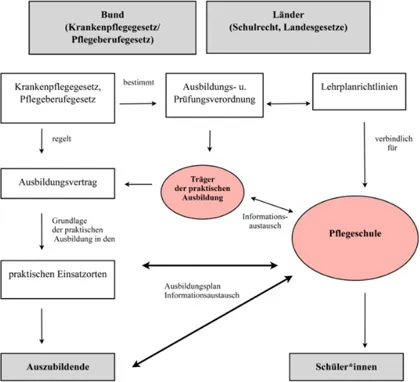 Für die Berufsausbildung in Deutschland gilt das „Duale System“. Dies bedeutet eine enge Zusammenarbeit der Bereiche, welche an der Ausbildung beteiligt sind - die Schule sowie der Ausbildungsbetrieb. Dieses System wurde primär mit dem Berufsbildungsgesetz geschaffen. Die Pflegeausbildung wird allerdings in Berufsfachschulen angeboten, welche im Schulrecht verortet sind. Sie unterliegen demnach nicht dem Berufsbildungsgesetz, sondern derzeit dem Krankenpflegegesetz und dem geltenden Schulrecht der Länder, weshalb die Pflegeausbildung bisher in allen Bundesländern unterschiedlich geregelt ist. Allerdings lässt sich das „Duale System“ der Berufsausbildung ohne Weiteres auf das Ausbildungssystem der Pflege übertragen. Zwar ist die Ausbildung in einer Berufsfachschule eine schulische Ausbildung, in welcher die theoretischen wie fachpraktischen Inhalte vermitteln werden, dennoch werden die Schüler*innen für das Erlernen ihrer beruflichen Handlungskompetenz im „Lernort Praxis“4 eingesetzt. 5