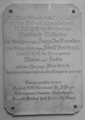 Versteckt vor den Besuchern erinnert eine Gedenktafel im Altarraum der Johanniskirche an den Abschluss zweijähriger Restaurierungsarbeiten. Sie gaben dem Gotteshaus vor 125 Jahren ihr heutiges Aussehen.