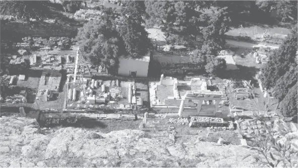 Die genannten Beispiele machen hinreichend deutlich, wie wichtig die natürliche Umgebung war, um sich der Heiligkeit eines Ortes bewusst zu werden. Griechische Kultstätten lagen häufig in Hainen, an Quellen oder an Flussmündungen, in Grotten sowie auf markanten Anhöhen oder Berggipfeln (s. u. S. →ff.). Die intensiv wahrgenommene Gegenwart des Göttlichen in der Natur war aber nur ein Kriterium von vielen, das zur Gründung eines Heiligtums an einem bestimmten Ort führen konnte. Das »Wesen« und die Wirkungsbereiche einer Gottheit hatten auf die Lage ihrer Sakralstätten ebenfalls beträchtlichen Einfluss. Beispielsweise lagen die Kultbezirke der Athena Polias und des Zeus Polieus, der »Städtebeschützer«, innerhalb der Stadtgrenzen, Heiligtümer von Natur- und Fruchtbarkeitsgöttern wie Demeter, Pan oder Dionysos oft im fruchtbaren Umland und Hermes, der Gott der Übergänge, wurde an Wegkreuzungen und Grenzen verehrt. Eine wichtige Rolle spielten die mit einem Ort verbundenen Mythen und religiösen Traditionen. So entstanden Kultbezirke an den Begräbnisstätten von Heroen oder an Plätzen, von denen man glaubte, eine Gottheit sei einst dort erschienen oder ihr Wirken habe dort auffällige Spuren hinterlassen. Manchmal wurde der Ort einer Verehrungsstätte durch einen Orakelspruch oder durch eine andere Form göttlicher Willensbekundung vorgegeben. Bei der Ortswahl waren auch immer topographische und kultische Gegebenheiten zu berücksichtigen. Bei der Neugründung eines Heiligtums musste man stets darauf achten, Konflikte zu bestehenden Kulten zu vermeiden. Als der Kult des Heilgottes Asklepios 420 v. Chr. in Athen eingeführt wurde, stand zunächst kein geeigneter freier Platz für eine eigenständige Sakralstätte zur Verfügung. Man brachte ihn daher vorübergehend im Eleusinion, dem städtischen Heiligtum der Demeter und der Kore, unter. Bald schon zog der Gott in den Kultbezirk eines Heilheros um, bis ihm endlich sein eigenes Heiligtum am Südabhang des Akropolisfelsens zugewiesen wurde (Abb. 2). Die Inbesitznahme durch Asklepios verlief indes nicht ohne Probleme. Es kam zu einem Disput mit dem Priestergeschlecht der Keryken, der zu einer Unterbrechung der Baumaßnahmen führte. Der genaue Grund für diesen Streit ist nicht überliefert, aber wahrscheinlich hatte er damit zu tun, dass die neue Kultstätte das Pelargikon, die uralte, in besonderen Ehren gehaltene mykenische Befestigungsmauer, verletzte.