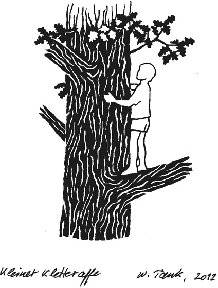 Der Junge beginnt den Abstieg. Wie mit Katzenkrallen halten sich die kleinen Finger in der rauen Eichenrinde fest. Gebannt schaut die Mutter zu, wenn die Sandalen immer wieder einen tieferen Spalt in der Rinde ertasten. Wie ein Eichhörnchen klebt das Kind am Baumstamm. Unglaublich, diese Akrobatik ...