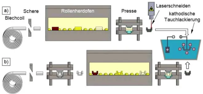 Die konventionelle Prozesskette des direkten Presshärtens (Abbildung 2-1 a), erläutert am Beispiel eines Bauteiles aus Stahl 22MnB5, besteht aus folgenden Schritten: