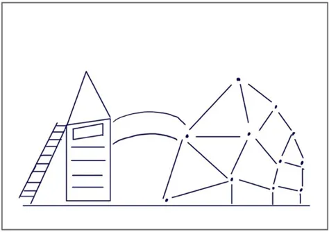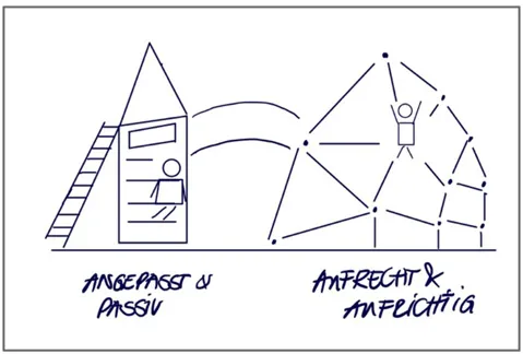 Das Neuland ist offener und komplexer. Die Grenzen zwischen innen und außen, zwischen Arbeiten und Nichtarbeiten gibt es nicht. Ebenfalls ist das Gerüst viel transparenter. Ich erkenne sofort, wer sich wie im Klettergerüst verhält. Wohingegen das Holzhaus eher verschlossen und intransparent ist. Im Strukturland warte ich eher ab, bis eine Aufgabe zu mir kommt. Im Neuland ist die eigene Arbeit ablesbarer. Ich warte nicht, bis eine Aufgabe zu mir kommt, sondern bringe mich aktiv ein und biete mich an.