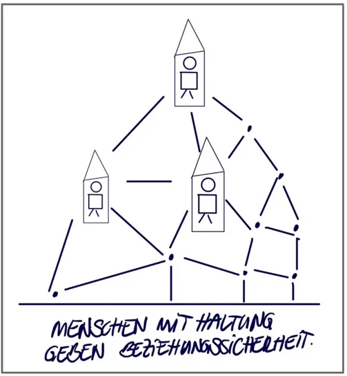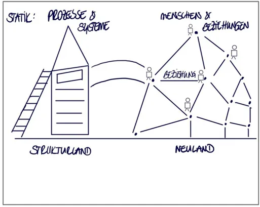 Im Strukturland sind Prozesse und Systeme die grundlegende Statik. Was ist das haltgebende Element im Neuland? Es sind die Menschen und Beziehungen. Diese sind wiederum in eine Statik der Kommunikation eingebettet. Im Detail bedeutet das: Der Einzelne beziehungsweise die Beziehungen sowie die Kommunikation untereinander sind entscheidend für die Stabilität im Klettergerüst.