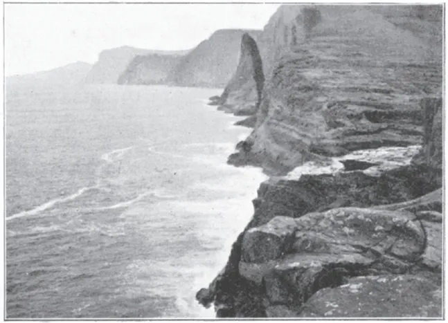 Bei der Ausfahrt aus dem Fjord ist das Wetter scheußlich und lässt diese Klippen von über 500 Metern Höhe, von denen einige über 350 Meter steil abfallen, noch großartiger und unvergesslicher erscheinen – sie bestehen aus phantastischen Formen, sind extrem tief gespalten, von Grotten durchhöhlt, wo das Meer hineinbraust, und zerrissen zu bizarren Obelisken von übernatürlichem Aussehen.