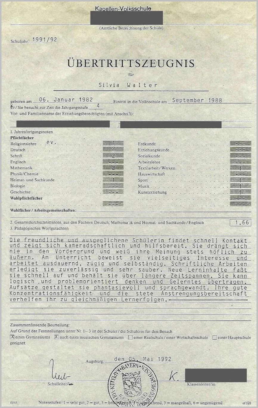 Ich erhielt eine "Empfehlung" der Grundschule, ein Gymnasium zu besuchen - und meine Eltern waren stolz auf mich, dass mein "Übertrittszeugnis" aus der 4. Klasse fast nur Bestnoten enthielt: