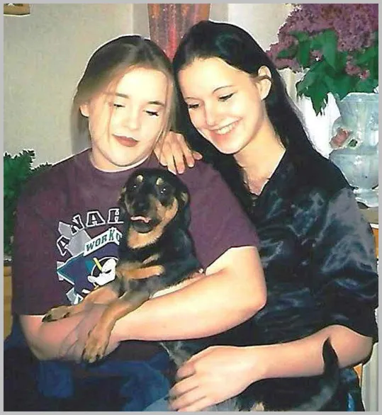 Zu sehen ist die Autorin im Alter von 15 Jahren (rechts) mitsamt ihrer Schwester und dem kleinen Familienhund "Waldi" (Foto aus dem Jahre 1997).