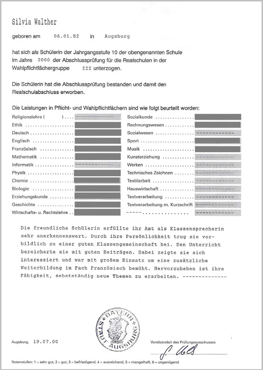 Abschlusszeugnis, Agnes-Bernauer-Realschule, 2000