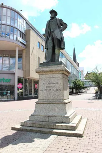 Der Freiherr Carl Ferdinand von Stumm, früher auch Hüttenbaron oder König von Saarabien genannt, schaut dem zuweilen munteren Treiben mit stoischer Miene vom hohen Sockel aus zu. Doch zuweilen wird er auch von Tauben in unserer Stadt heimgesucht, nicht immer zu seinem Vorteil, wovon das folgende Gedicht zu berichten weiß.
