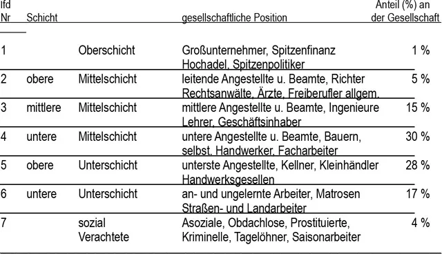 Gerhard Kleining kam bei Berücksichtigung der gesellschaftlichen Stellung auf sieben Schichten der Bevölkerung.8 (s. Tab. 1)