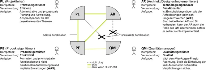 Die Anzahl der Rollen ist ungleich der Anzahl der Personen, es kann also eine Person gleichzeitig mehrere Rollen einnehmen. Dies hat jedoch Grenzen. Einerseits durch die Arbeitslast und andererseits setzen unterschiedliche Rollen unterschiedliche Fähigkeiten und Charaktereigenschaften voraus. Zudem können gewisse Rollen gegenläufige Interessen mit sich bringen. Um diese potenziellen Interessenkonflikte zu vermeiden, sind daher gewisse Kombinationen von Rollen nicht zulässig (siehe Abb. 10).