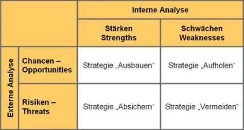 Beide zusammen, die interne und die externe Analyse, ergeben nun wieder die SWOT-Analyse. Um diese beiden unterschiedlichen Analysen darstellen und kombinieren zu können, werden die vier Elemente in einer Matrix dargestellt. Anhand dessen können verschiedene Maßnahmen und Strategien für das Unternehmen abgeleitet und entwickelt werden. 6