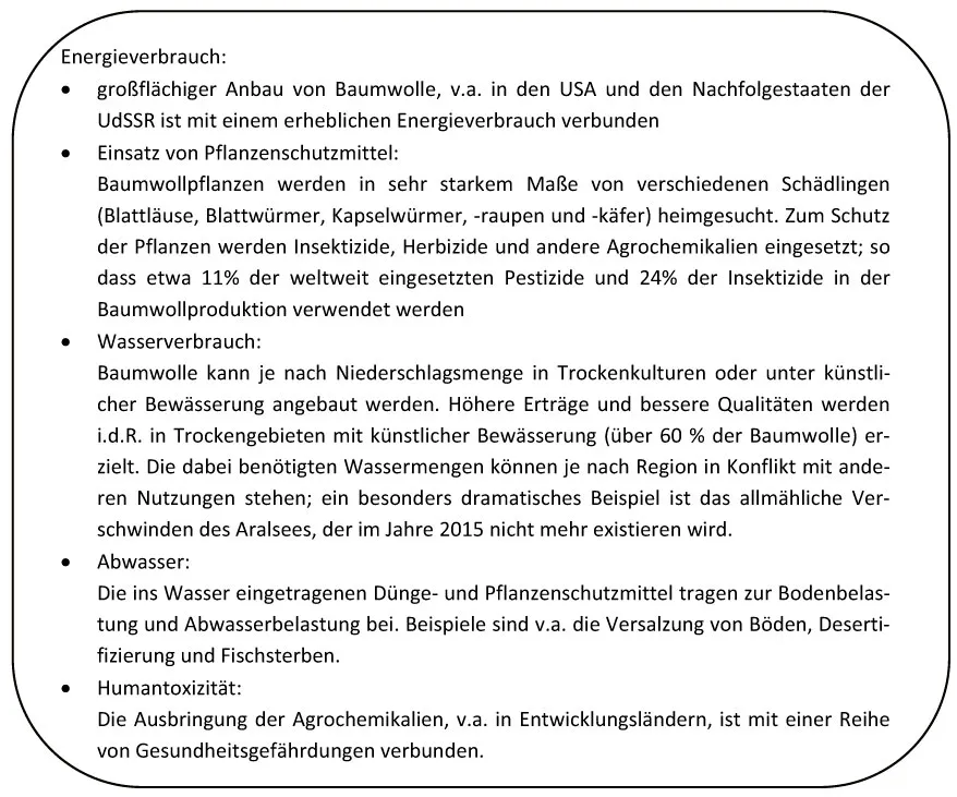 Entgegen ihres sauberen Images als Naturfaser hat ihr Anbau jedoch schwerwiegende ökologische Konsequenzen. Das allmähliche Austrocknen des Aralsees (vor vierzig Jahren noch der viertgrößte Süßwassersee auf der Welt) auf 20 Prozent seiner ursprünglichen Fläche5 und das massenhafte Vogelsterben im Bodenseeraum in den 80er Jahren, verursacht durch den Einsatz von bedenklichen Pflanzenschutzmitteln im Baumwollanbau6, sind nur einige davon.