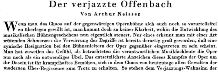 In der Zeitschrift für Musikwissenschaft wurde Jazz 1929 im Zusammenhang mit den Komponisten Kurt Weill und Arthur Honegger erwähnt. Sie enthielt zudem einen Verweis auf „Ein Jazzintermezzo in der Quinta“. Leider haben Nationalsozialisten die damit zusammenhängende Diskussion über Musikstile völlig ins Abseits gelenkt, indem Jazz als „Negermusik“ rassistisch diffamiert und dann zu der sogenannten „Entarteten Musik“ hinzugezogen wurde. Leitbegriff des Aufrufs war dagegen „Ernste Musik“. Die dahinter verborgene und in Deutschland verbreitete Auffassung wird im nächsten Teil – Programm und Publikum - aufgegriffen.