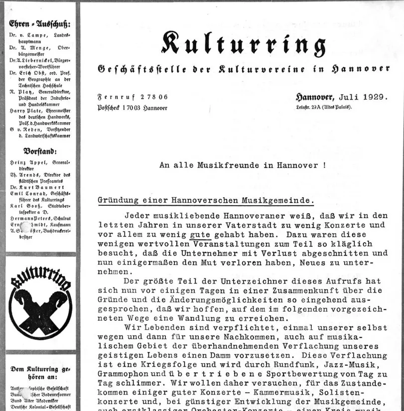 Wir sind überzeugt, daß das Musikleben Hannovers damit einen neuen — wenn auch zunächst nur einen bescheidenen — Aufschwung nehmen wird. Alles Geschäftliche scheidet aus, wir denken nicht daran, irgendeinen Unternehmer oder bestimmte Künstlerkreise zu bevorzugen, vielmehr bitten wir Wünsche zu äußern und Vorschläge zu machen. Die Geschäftsführung dieser Musikgemeinde übernimmt der ‚Kulturring‘.“