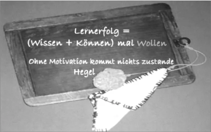 Motivation leitet sich von Motiven ab. Von den vielen Arten der Motivation interessieren uns hier vor allem die Lern- und Leistungsmotivation. Die Gleichung (vgl. Tafel) macht deutlich, wie wichtig der Lernmodulator oder Stützfaktor Motivation ist. Ohne Wollen wird das Ergebnis des Produkts gleich null: Null Leistung bei null Bock! Motivation ist eine Art Motor und Lenkung des Lernens.