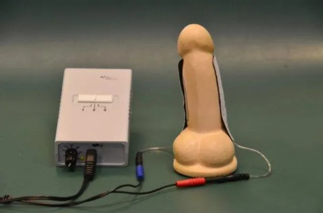 Dieses Foto wurde wahrscheinlich von einem promovierten Physiker gemacht, welcher eine Alternative zu Viagra gesucht hatte; wir konzentrieren uns in diesem Buch vor allem auf das hiesige Modell des erigierten Penis und in unserer Fantasie stehen die Elektroden symbolisch für unsere eigenen oralen und manuellen „Stimulanz-Werkzeuge“.