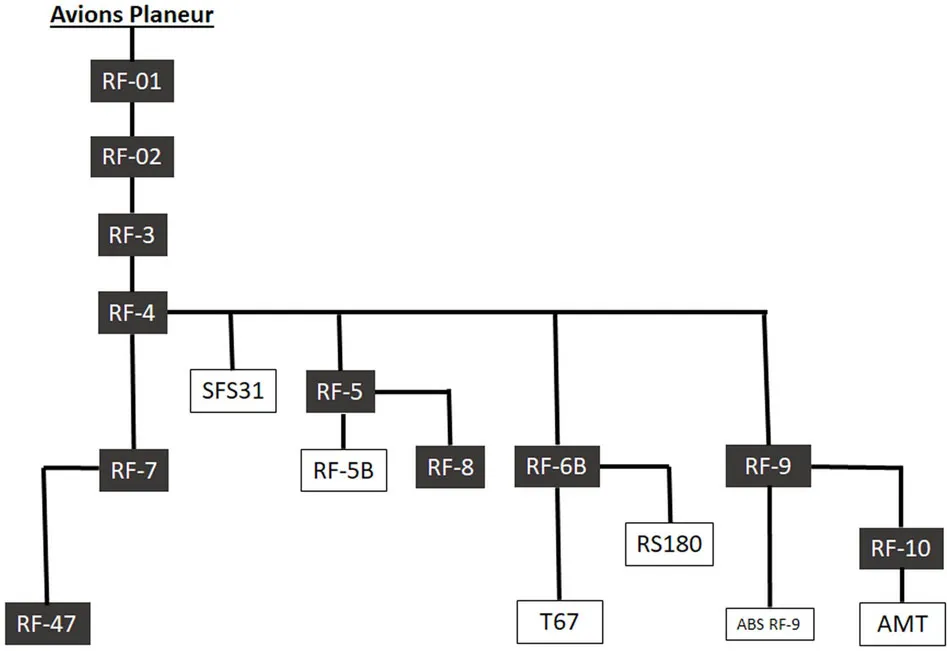 Mit der RF-01 entstand bis 1960 der Prototyp des „Avion Planeur“. Die nachfolgenden RF-02, RF-3 und RF-4 waren bis 1966 direkte Ableitungen aus der RF-01. Auch die einsitzige RF-7 war Ende der 60er Jahre noch eine direkte Ableitung aus der RF-01 bzw. RF-4. Die RF-4 diente Fournier in den 70er Jahren dann als Ausgangsmuster für eine Reihe zweisitziger Flugzeugentwürfe. Der Tandemsitzer RF-5 und der in Ganzmetall ausgeführte Trainer RF-8 stellen vom Grundentwurf her prinzipiell nur eine um einen zusätzlichen Sitz verlängerte RF-4 dar und folgen damit noch den Auslegungskriterien des „Avion Planeur“ aus den 50er Jahren.