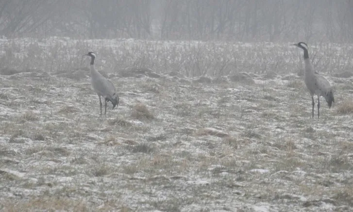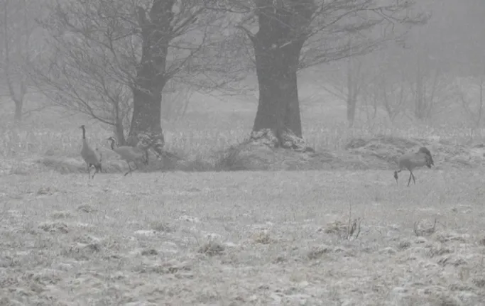 Der Eigentümer dieser Wiese hatte keinerlei Interesse an Kranichen, sie standen wohl eher seinen kommerziellen Zielen im Weg. Sein Plan: Kranichstörung – in massivster Form- um sie zu vertreiben. Das Auto wurde zur Waffe: Zielgerichtet wurde etliche Male auf die nahrungssuchenden Kraniche zugefahren, und das in einem FFH-Gebiet! Das Kranichgebiet wurde mit dem Quad umrundet, mit dem Trecker eingekreist, das Gebiet mit Hunden durchstreift. Männer mit Jagdflinten in der Hand durchkämmten die Wiese. Und das im sehr kalten Spätwinter. Die legendäre Standorttreue der Kraniche fand ihre Grenze. Die ohnehin schon fast aufgebrauchten Kraftreserven des Kranichpaares wurden durch unzählige Fluchtabflüge im kalten Winter gänzlich verbraucht. Es blieb ihnen nichts anderes übrig - sie mussten ihr altes Brutgebiet verlassen. Bis heute sind sie nicht zurückgekehrt.