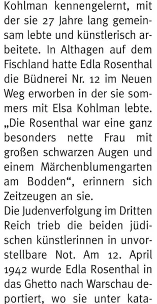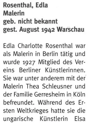 Die jüdische Kunstmalerin Edla Charlotte Rosenthal (1883 - 1942) wuchs wohlbehütet in der großen gutbürgerlichen Familie Burchardt / Markwald / Rosenthal in Berlin auf. Schon durch den 1. Weltkrieg veränderte sich ihre Welt, als nach dem Tode der Eltern der geliebte Bruder 1917 fiel. Die massiven Veränderungen durch den Nationalsozialismus verstand sie anfangs kaum, glaubte lange, vielleicht zu lange, doch eigentlich nur Deutsche zu sein. Mit dem letzten Deportationszug kam sie am 14. April 1942 vom Gleis 17 des Bahnhofes Berlin-Grunewald ins Warschauer Ghetto und gehörte zu den ersten, die während der "Großen Aktion" Ende Juli 1942 im fertiggestellten Vernichtungslager Treblinka ermordet wurde. Sie hinterließ winzige Spuren, wäre vergessen worden, wenn nicht die Autorin Astrid Beier acht Jahre lang akribisch nach ihr gesucht hätte. Es gelang ihr, Fotos, Briefe, Familienmitglieder und einige ihrer Bilder und Ausstellungsorte zu finden. Am Ende des Buches leben der Mensch Edla Charlotte Rosenthal und ihre Freundin Elza Kohlmann (1889 - 1943) wieder vor unserem geistigen Auge.