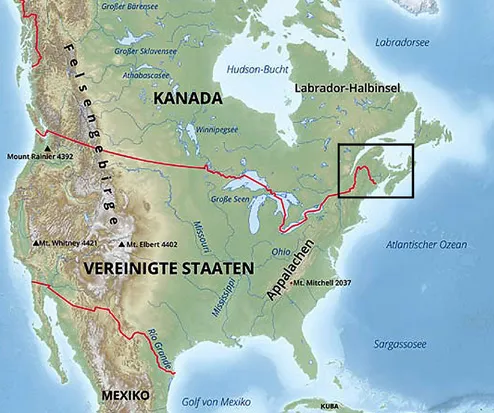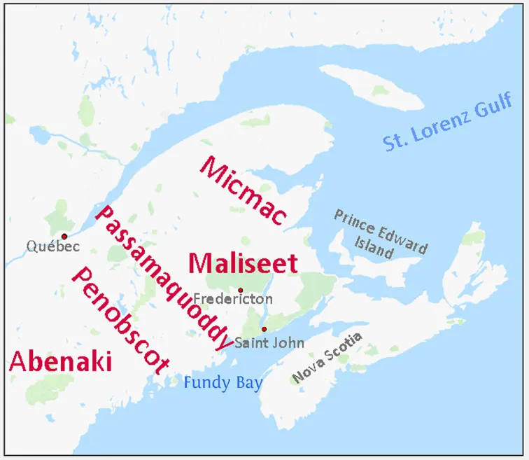 Die ursprünglichen Siedlungsgebiete der Stämme, die sich zur Wabanaki-Konföderation zusammengeschlossen hatten.