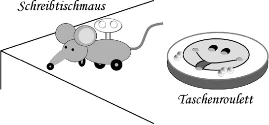 Die kleine mechanische Schreibtischmaus wechselt dank geschickt angebrachter und um 90 Grad versetzter Rädchen die Richtung, sobald sie vom Schreibtisch zu fallen droht; ein einstmals überaus beliebtes Büro-Accessoire, das in fast keiner Amtsstube fehlte. Das Taschenroulett, eine kleine Dose mit durchsichtigem Deckel und fünf winzigen Kügelchen, die man durch leichtes Fingertippen in fünf ebenfalls winzige Vertiefungen dirigieren muss, wurde bei Versammlungen und Vorträgen geschätzt und erst durch seine elektronischen Varianten auf Handys und Organizern verdrängt.