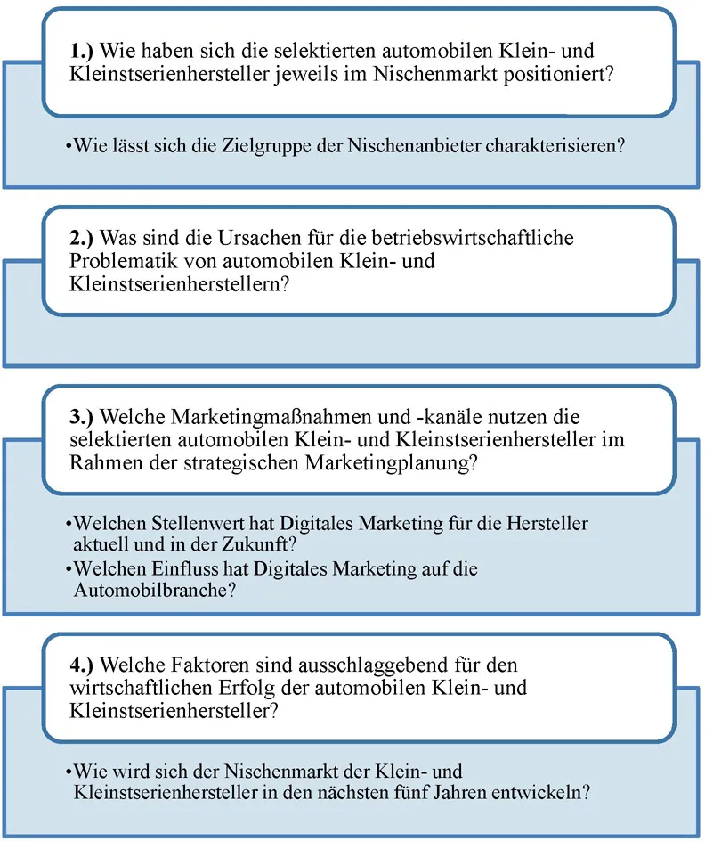 In der wissenschaftlichen Fachliteratur ließen sich keine Forschungsarbeiten über den Nischenmarkt der Klein- und Kleinstserienhersteller recherchieren. Bisherige mediale Berichterstattungen skizzieren die Welt der automobilen Klein- und Kleinstserienhersteller nur oberflächlich. Damit stellt der automobile Nischenmarkt und sein Marketing ein bisher noch unerforschtes Themengebiet dar.