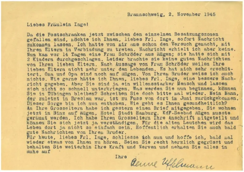 Da die Postschranken jetzt zwischen den einzelnen Besatzungszonen gefallen sind, möchte ich Ihnen, liebes Frl. Inge, sofort Nachricht zukommen lassen. Ich hatte von mir aus schon den Versuch gemacht, mit Ihren Eltern in Verbindung zu treten. Nachricht erhielt ich aber keine. Nun kam vor 14 Tagen eine Frau Schröder aus Rügen; sie hatte sich mit 2 Kindern durchgeschlagen. Leider brachte sie keine guten Nachrichten von Ihren lieben Eltern. Nach Aussage von Frau Schröder weilen Ihre lieben Eltern nicht mehr unter den Lebenden. Es hat mich sehr erschüttert. Oma und Opa sind noch auf Rügen. Von Ihrem Bruder weiss ich auch nichts. Wie gerne hätte ich Ihnen, liebes Frl. Inge, eine bessere Nachricht gegeben. Aber Sie sind ja ein willensstarker Mensch und lassen sich nicht so schnell unterkriegen. Was werden Sie nun beginnen, können Sie in Tübingen bleiben? Schreiben Sie doch bitte mal wieder. Mein Mann, der zuletzt in Breslau war, ist zu Fuss von dort im Juni zurückgekommen. Dieser Sorge bin ich nun enthoben. Wie geht es Ihnen gesundheitlich? An Ihre Grosseltern habe ich gestern einen Brief mitgegeben. Sie wohnen jetzt in Binz auf Rügen, Hotel Stadt Hamburg. KdF-Seebad Rügen musste geräumt werden. Ich habe Ihren Grosseltern Ihre Anschrift mitgeteilt und so können Sie sich jetzt ja verständigen. Für die alten Leutchen wird das Leben dort ja nicht so einfach sein. Hoffentlich erhalten Sie auch bald gute Nachricht von Ihrem Bruder.