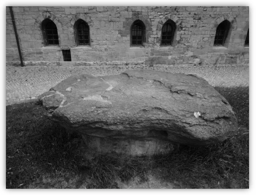 Den riesigen Stein, den der Teufel noch immer drohend in seiner Hand hielt, warf er direkt vor den Dom zu Füßen der Menschen. Er sollte sie daran erinnern, dass sie nicht eidbrüchig werden und sich seiner stets gedenken. Noch heute liegt dieser „Lügen- oder Teufelsstein wie unverrückbar vor dem Dom und trägt des Teufels Zeichen. Die glühenden Finger des Urians haben sich nämlich tief in den Felsen eingedrückt.