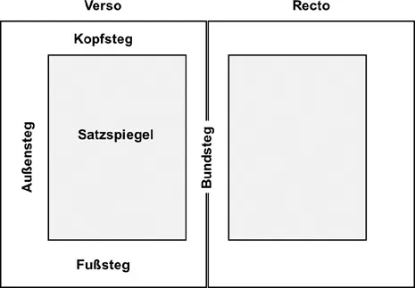Grundlage einer harmonischen Buchgestaltung ist die Gestaltung des Satzspiegels – die Bestimmung des Textbereiches unter Berücksichtigung der Stege und der Bindekorrektur. Die Harmonie wird bestimmt durch das Verhältnis von Bundsteg : Außensteg sowie Kopfsteg : Fußsteg. Mit den Diagonalen in der nachfolgenden Abbildung lässt sich dieses Verhältnis überprüfen.