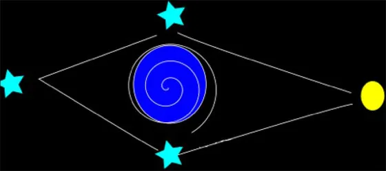 Bild 10: Gedankenexperiment von John Archibald Wheeler: erst der Experimentator entscheidet, welchen Weg die vor Jahrmilliarden ausgesandten Photonen eines Quasars genommen haben müssen