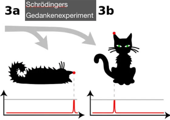 Aus Sicht der Quantentheorie könnte die Antwort lauten: In einer Überlagerung aus den beiden Zuständen „tot“ und „lebendig“. Die Wellenfunktion der Katze würde aussehen wie in Bild 2 der Zeichnung unten. Diese Superposition ist nicht mehr nachweisbar, wenn ein Beobachter die Kiste öffnet: Abhängig vom Zustand des Atoms in der Mordmaschine geht die Katze entweder in Zustand 3a oder 3b über.